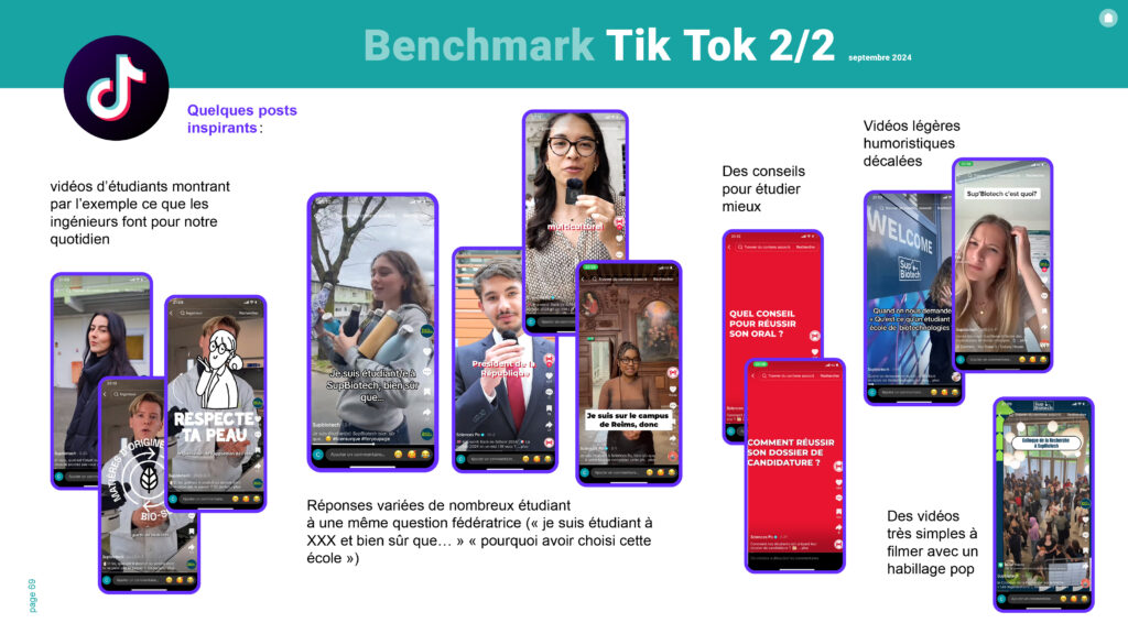 • Création du calendrier éditorial Social Media à destination des lycéens, étudiants et parents (naturelle et payante FB, IG, LinkedIn et TikTok)